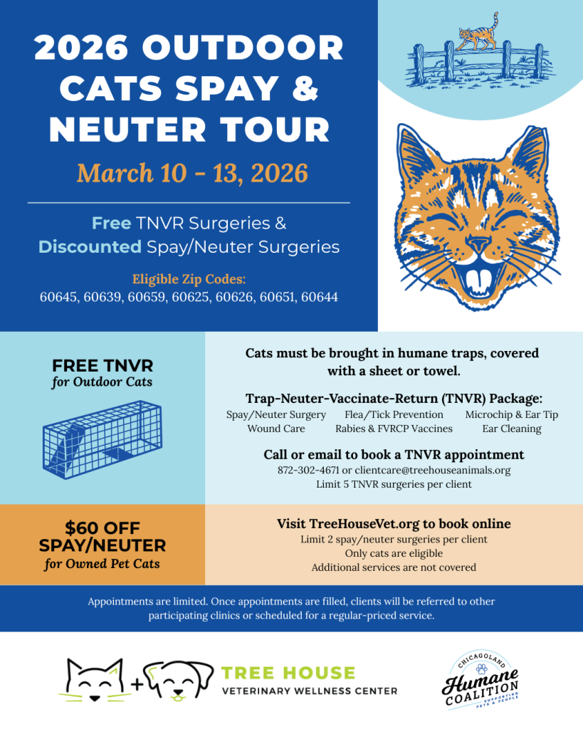 We’re proud to partner with the Chicagoland Humane Coalition in offering free TNVR surgeries and $60 off spay/neuter surgeries for owned pet cats from March 10–13. This opportunity is available to residents of 60645, 60639, 60659, 60625, 60626, 60651, and 60644. For more details, view the event flyer here.